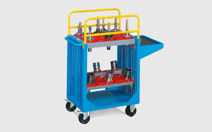 The CNC tool roller cabinet is equipped with bush-holder frames with supports, wheels with brakes and a convenient side handle.