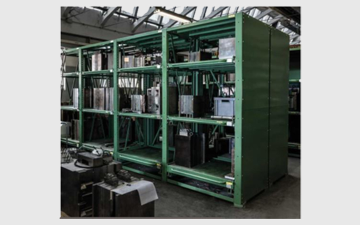 SYSTEM AR Heavy duty industrial metal shelving with extensible shelves is particularly suitable for storing very heavy material moulds, engines, etc.